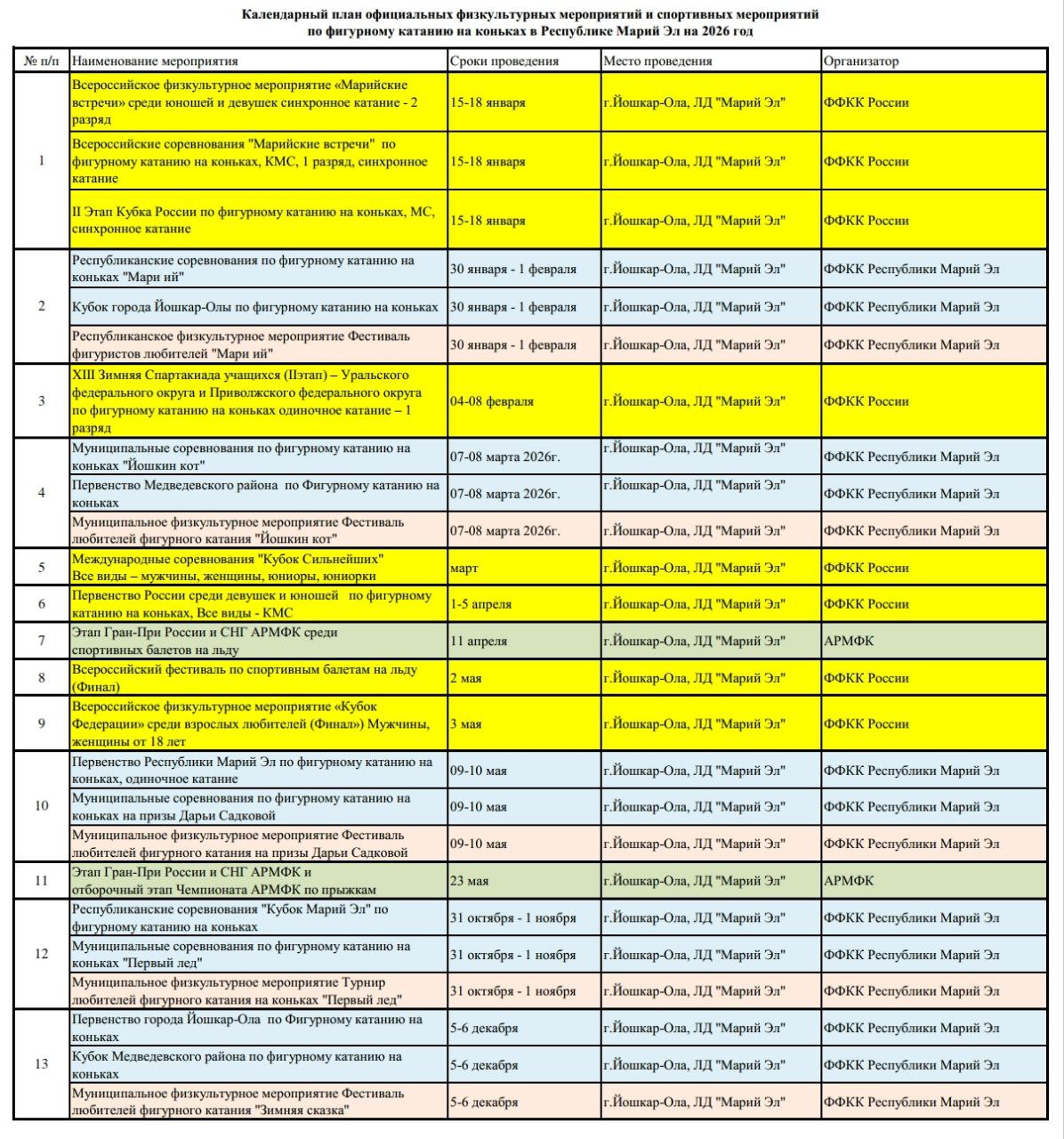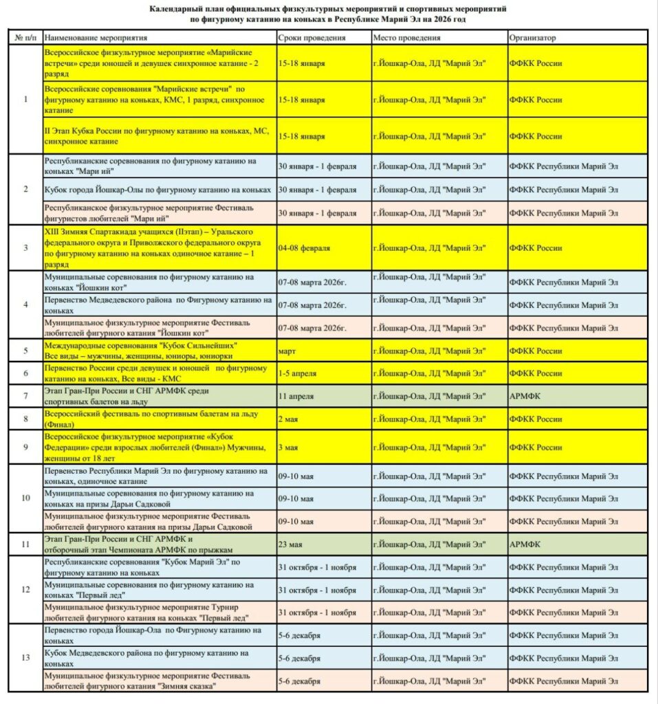 Календарный план официальных физкультурных мероприятий и спортивных мероприятий по фигурному катанию на коньках в Республике Марий Эл на 2026 год